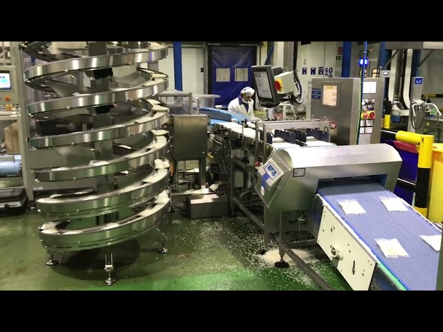 Рішення на базі конвеєра X85, з вбудованою спіраллю. Задля економії монтажної площі (footprint), дві спіралі розміщені навколо спільної осі, одна над одною. Окрім економії робочого місця, це рішення дозволяє збирати продукт з двох різних конвеєрів та збільшує продуктивність лінії.Спіральний конвеєр FlexLink — компактне та ефективне рішення для вертикального транспортування продукції. Завдяки спіральній конструкції він забезпечує плавне переміщення виробів між різними рівнями виробничої лінії без зупинок та накопичення.1. Геометричні та конструктивні характеристики:- Діаметр центру: 1000 мм.
